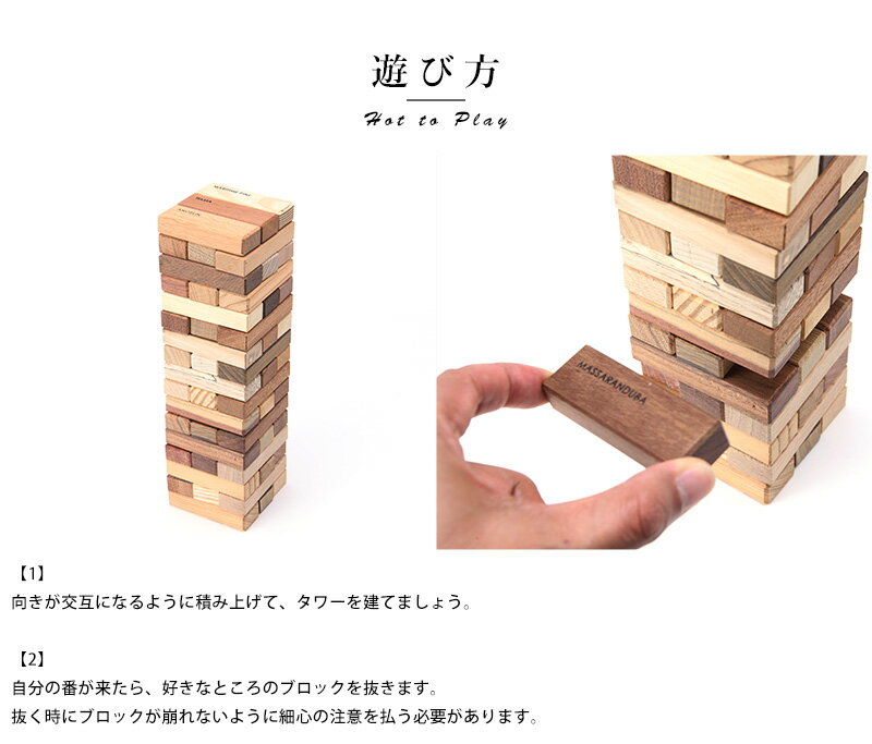 それぞれのピースは同じサイズですが、木材によって質量が変わるため、一般的なジェンガとは異なる駆け引きを生み出しています。